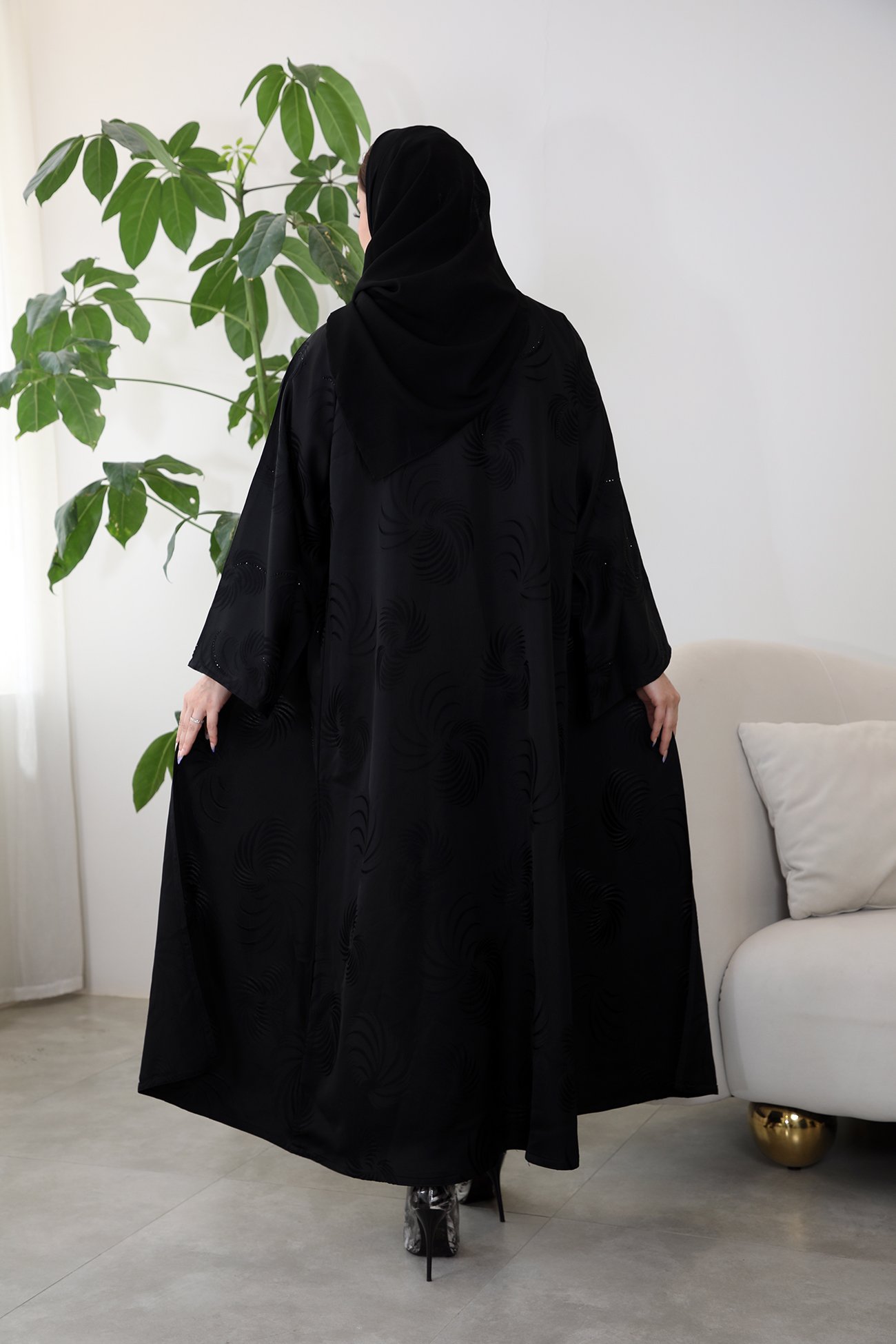 عباية مميزة بقماش بلاك بيري باللون الأسود مصممة بتطريز انيق واكمام مفتوحة لتمنحك اطلالة مميزة تناسب صيفك من عبايات فريزيا