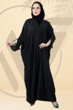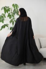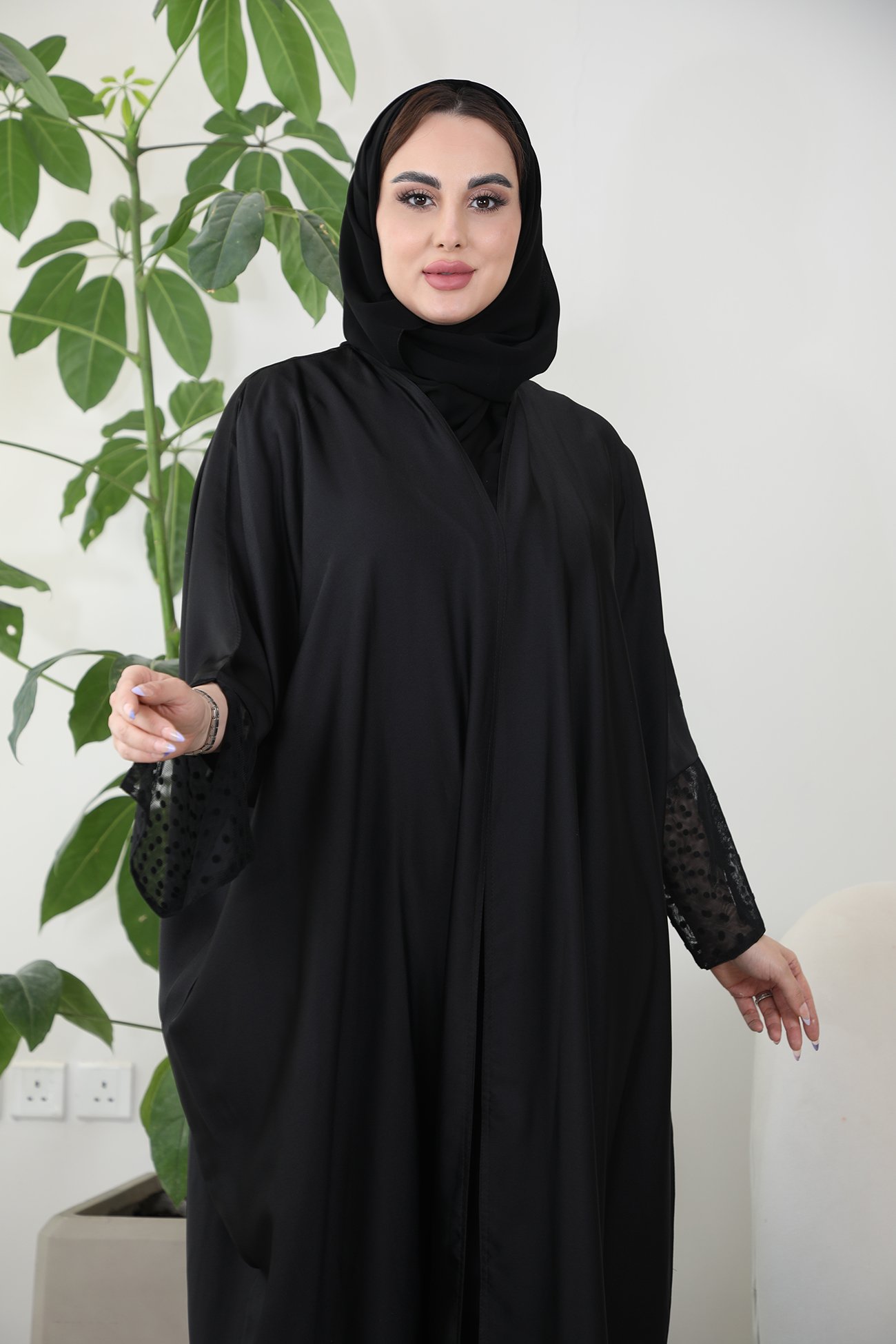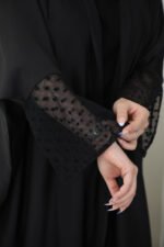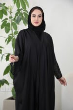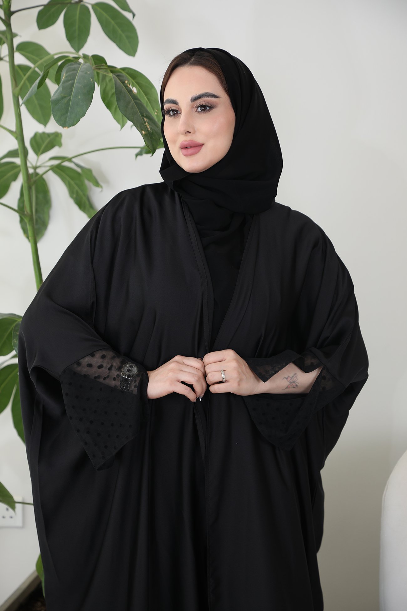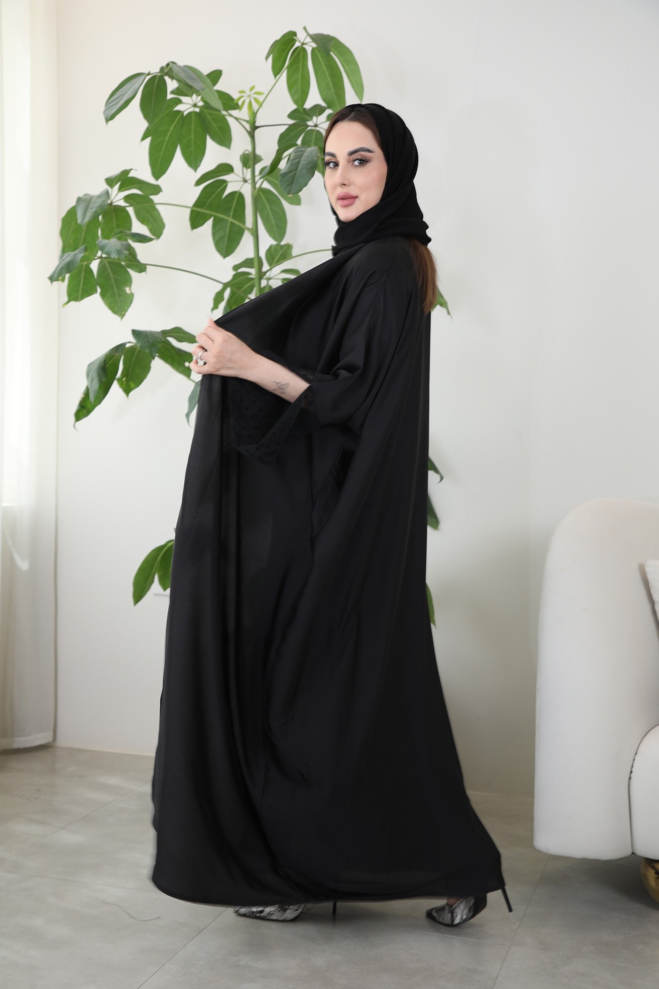 عباية مميزة بقماش حرير باللون الأسود مصممة بموديل فراشة بأكمام دانتيل مفتوحة لتمنحك اطلالة مميزة تناسب صيفك من عبايات فريزيا